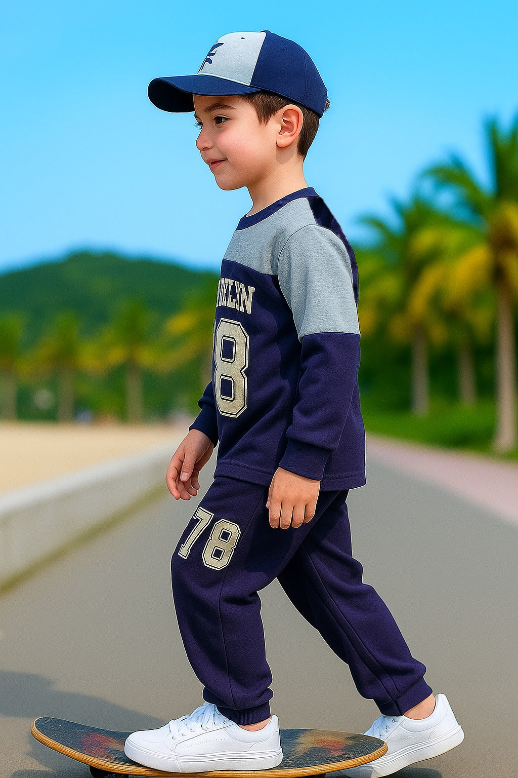 Upgrade your child’s wardrobe with this stylish Brooklyn 78 Printed Sweatshirt & Jogger Set for Boys. Designed from premium hosiery cotton, this kids’ clothing set is soft, stretchable, and gentle on delicate skin, ensuring all-day comfort and durability. The modern navy blue and grey color-block design with bold “Brooklyn 78” print gives a sporty and trendy vibe, making it perfect for school, playdates, and casual outings.