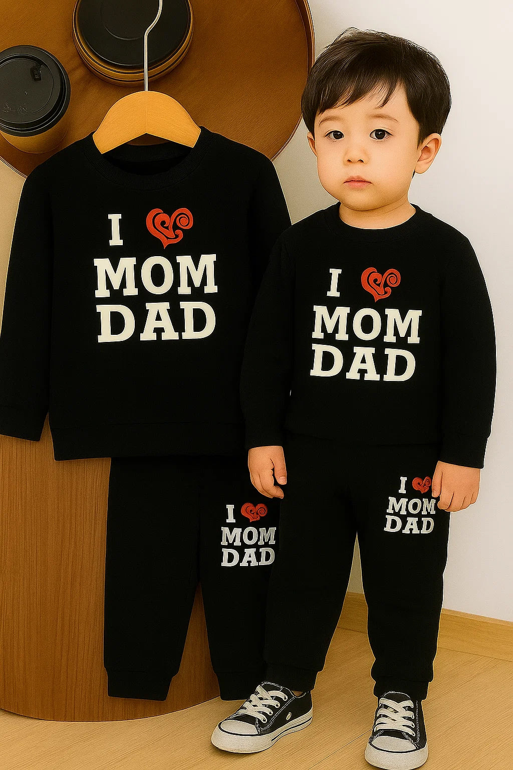 Dress your little one in this adorable kids' clothing set featuring the sweet and stylish “I ❤️ MOM DAD” print. Perfectly designed for both boys and girls, this two-piece outfit includes a cozy full-sleeve sweatshirt and matching jogger pants, making it an ideal choice for everyday wear.