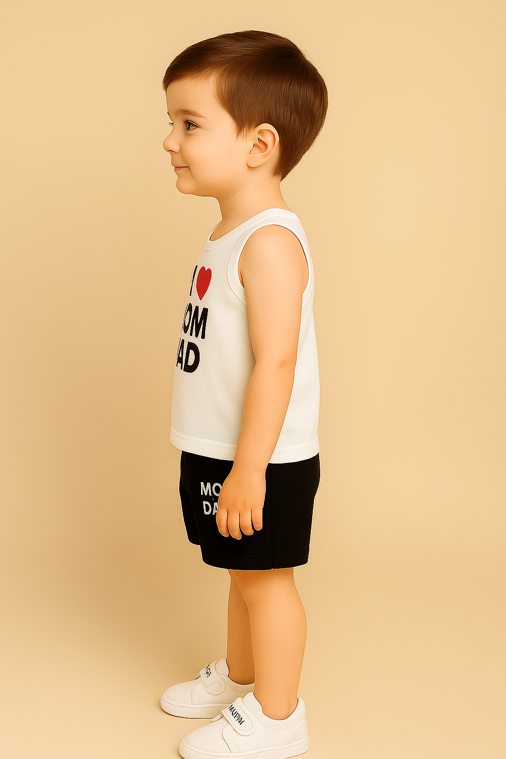 Cute Kids Clothing Set – White “I ❤️ MOM DAD” Sleeveless T-Shirt & Black Shorts
