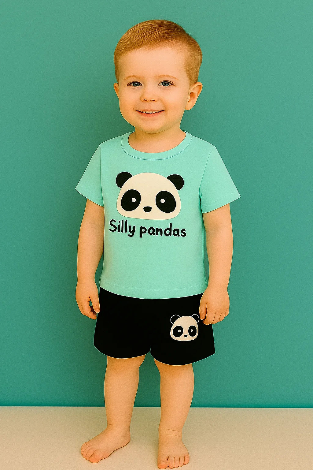 Add fun and comfort to your child’s everyday look with this adorable kids clothing set, featuring a panda print aqua blue T-shirt paired with black shorts. Designed with a playful “Silly Pandas” graphic, this outfit is perfect for little boys and girls who love cute and cheerful styles.