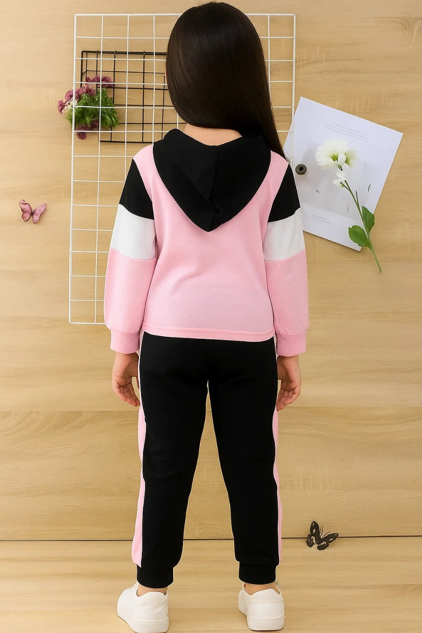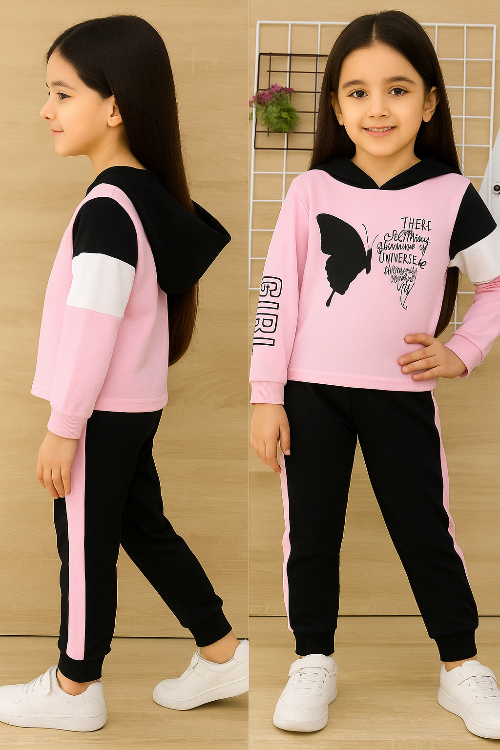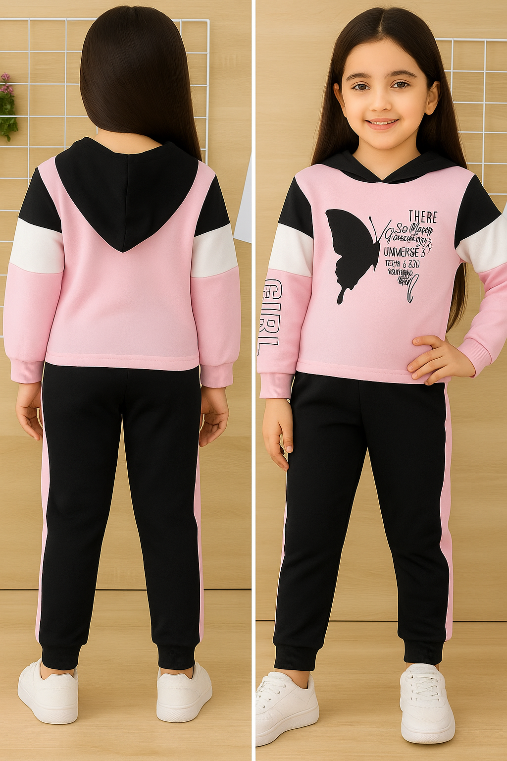 Dress your little one in style with this trendy girls’ hoodie and joggers set, designed for both comfort and fashion. Featuring a cute butterfly graphic with motivational text on the hoodie, this pink and black kids clothing set adds a stylish twist to everyday wear. The contrast sleeves and side-striped joggers make it a fashionable yet practical choice for active kids.