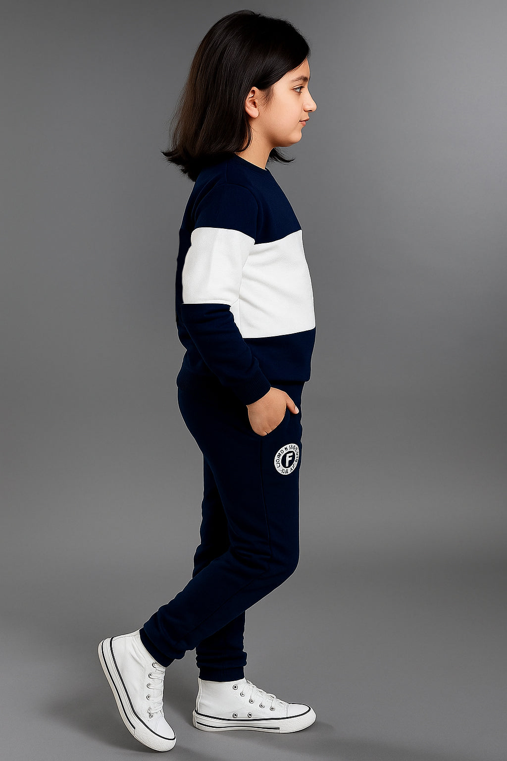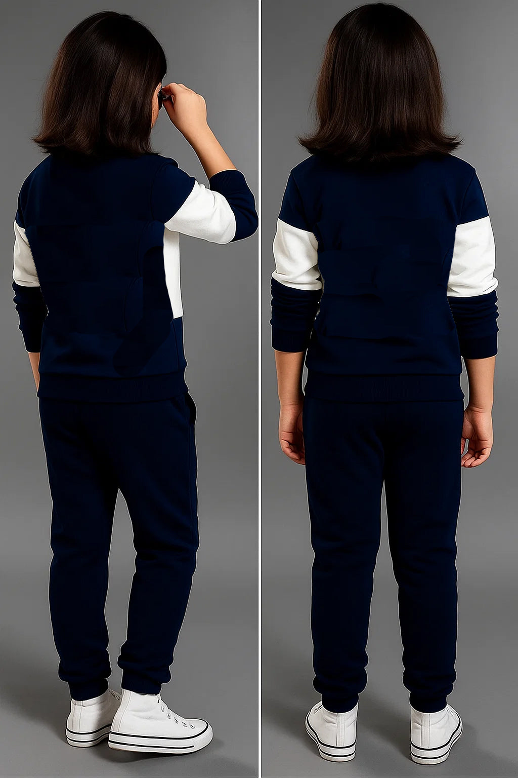 Crafted from premium-quality cotton fabric, this unisex kids outfit offers a soft, breathable, and flexible fit — ideal for all-day comfort. The color-block design in navy blue and white gives a modern and fashionable appeal, while the ribbed cuffs and waistband ensure a snug, secure fit. The elasticated waistband with drawstring on the joggers provides adjustability and convenience for growing kids.
