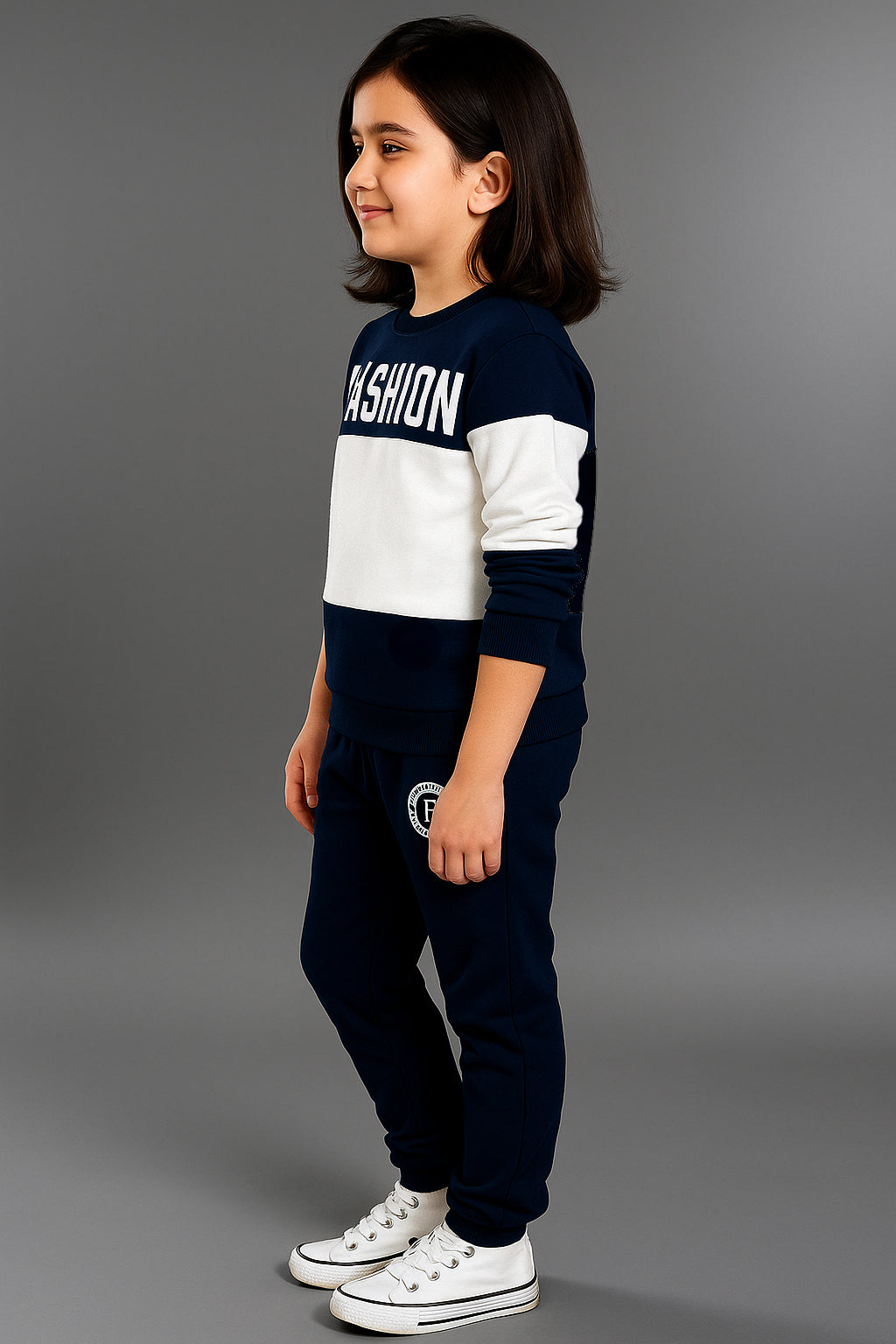 Upgrade your child’s wardrobe with this Trendy Navy Blue & White Kids Clothing Set, designed for both boys and girls who love to stay stylish and active. This two-piece kids tracksuit set includes a long-sleeve sweatshirt with bold "FASHION" lettering and matching jogger pants, making it the perfect outfit for casual wear, sports, or school.