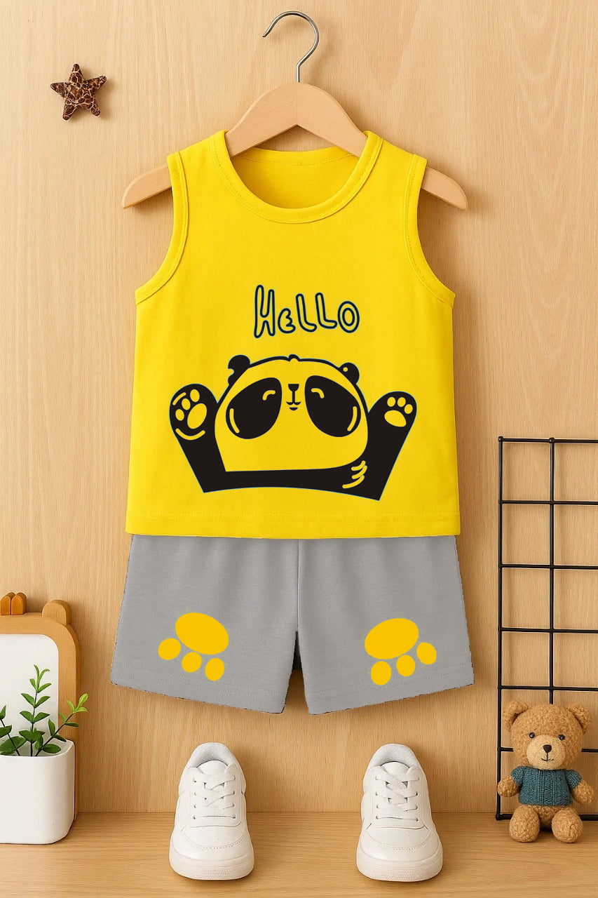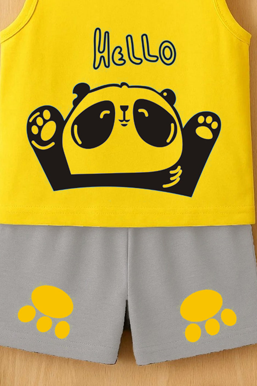 Cute Panda Print Kids Summer Clothing Set – Yellow Sleeveless T-Shirt & Grey Shorts