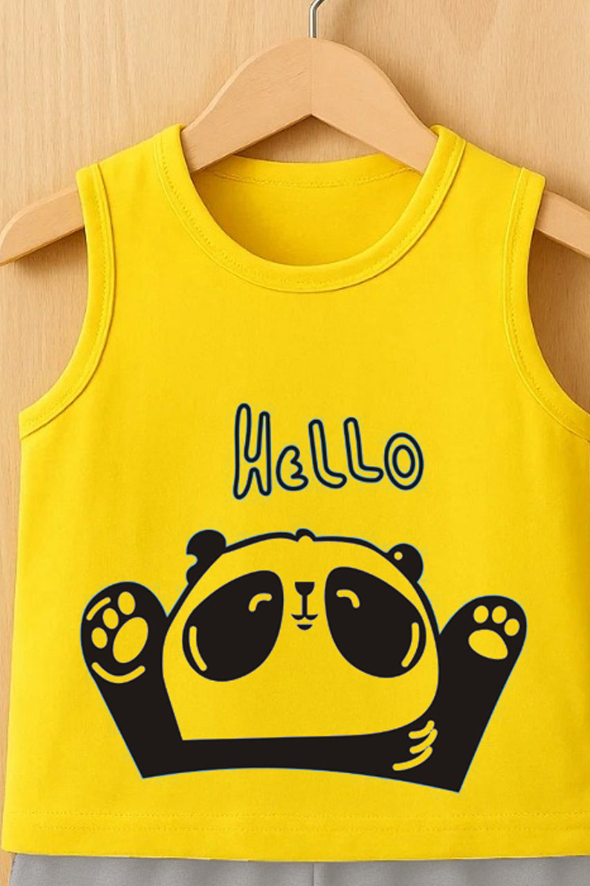 Bright yellow sleeveless T-shirt with cute panda “Hello” print