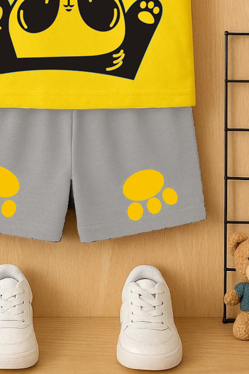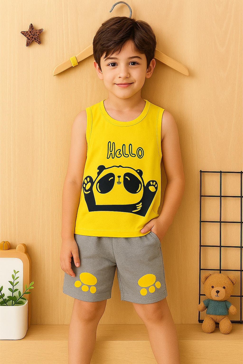 Brighten up your child’s summer wardrobe with this adorable kids clothing set, featuring a yellow sleeveless T-shirt with a playful panda print and comfortable grey shorts with paw designs. Perfect for hot days, this set combines fun, style, and comfort in one.